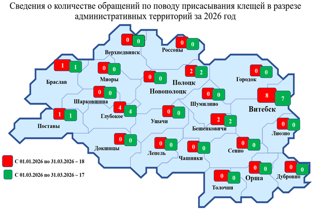 За три месяца 2026 года в Витебской области зарегистрировано 18 случаев обращений в ОЗ по поводу укуса клеща, из них 8 – дети (за аналогичный период 2025 года – 16 всего, 9 – дети). Территориально случаи присасывания клещей регистрировались: на территории загородных дачных участков и территории сельской местности – 12 (66,7%), не установлено – 4 (22,2%), лесных массивов – 1 (5,5%), на территории жилых застроек городов – 1 (5,5%).