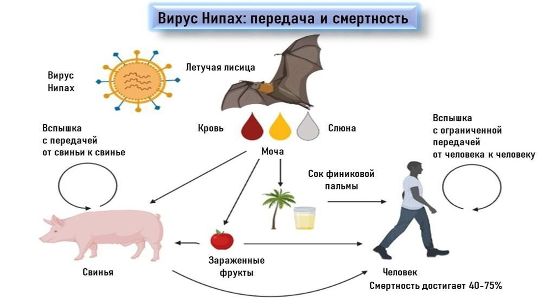 Вирус Нипах связан с высокой смертностью: уровень летальности колеблется от 40 до 75% в зависимости от вспышки и штамма вируса.